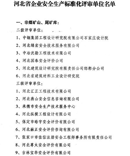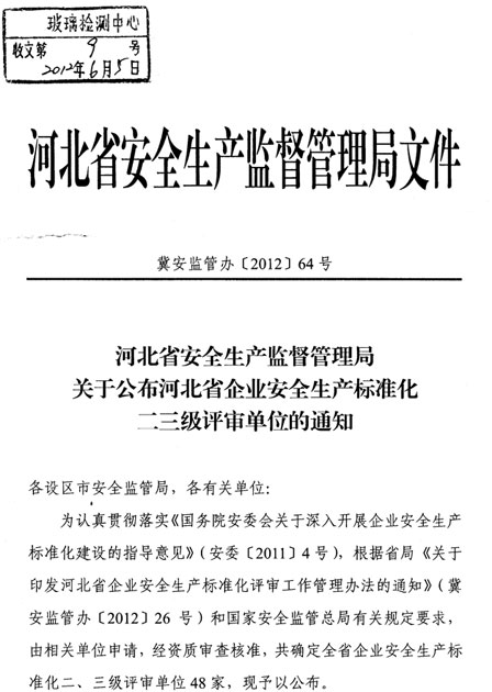 為了引導建材企業能夠安全生產,減少事故的發生,河北省安全生產協會組織評定了企業安全生產標準化評審單位,中國建材檢驗認證集團秦皇島有限公司(國家玻璃質量監督檢驗中心)被評為河北省建材行業二級評審單位。